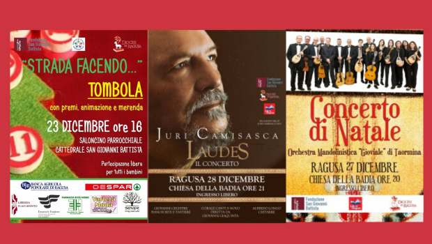 Per quanto riguarda gli eventi aperti al pubblico, il primo appuntamento è dedicato ai più piccoli; giorno 23 dicembre alle ore 16, nel saloncino della Cattedrale San Giovanni, si svolgerà una tombola animata dai responsabili del progetto educativo “Strada facendo” sorto all’interno del Siproimi “Vivere la vita” del Comune di Ragusa. A conclusione di un anno di incontri ed attività di educativa di strada, gli animatori daranno vita ad una tombola con premi, merenda a partecipazione libera per tutti i bambini.