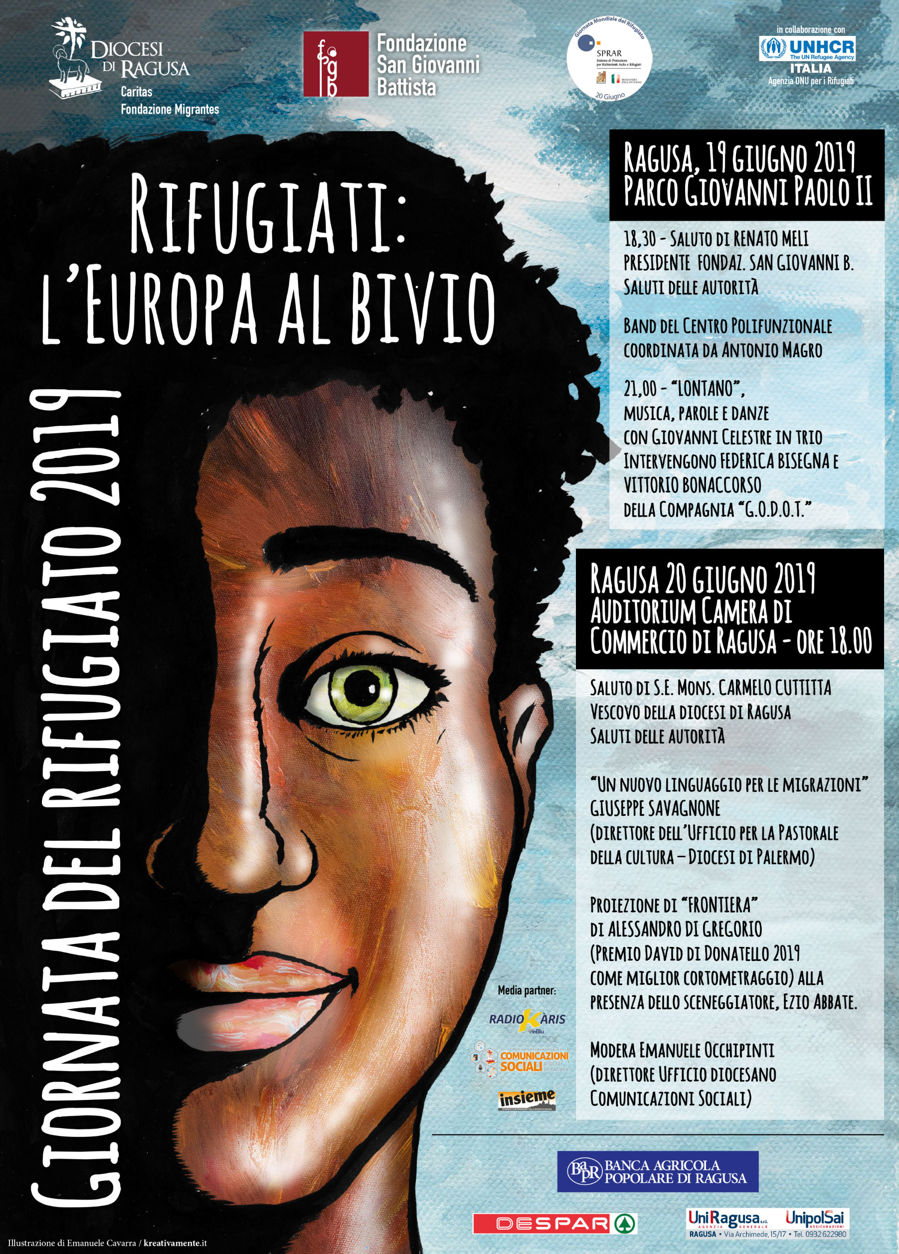 Il 20 giugno si celebra la Giornata Mondiale del Rifugiato, per sensibilizzare l’opinione pubblica sulla condizione di oltre 70 milioni di rifugiati, richiedenti asilo e sfollati nel mondo che, costretti a fuggire da guerre e persecuzioni, lasciano i propri affetti, la propria casa e tutto ciò che un tempo era la loro vita per cercare salvezza in un altro paese. E soprattutto invita a non dimenticare mai che dietro ognuno di loro c’è una storia che merita di essere ascoltata. Storie di sofferenze, di umiliazioni ma anche di chi è riuscito a ricostruire il proprio futuro, offrendo il proprio contributo alla società che lo ha accolto. La Diocesi di Ragusa e la Fondazione San Giovanni Battista organizzano la giornata dividendola in due momenti: il 19 giugno al Parco Giovanni Paolo II si esibirà la Band del Centro Polifunzionale Coordinata da Antonio Magro e, a seguire, verrà presentato l’album “Lontano” di Giovanni Celestre. Intervengono Federica Bisegna e Vittorio Bonaccorso. La serata sarà introdotta da Renato Meli, presidente della Fondazione San Giovanni Battista.