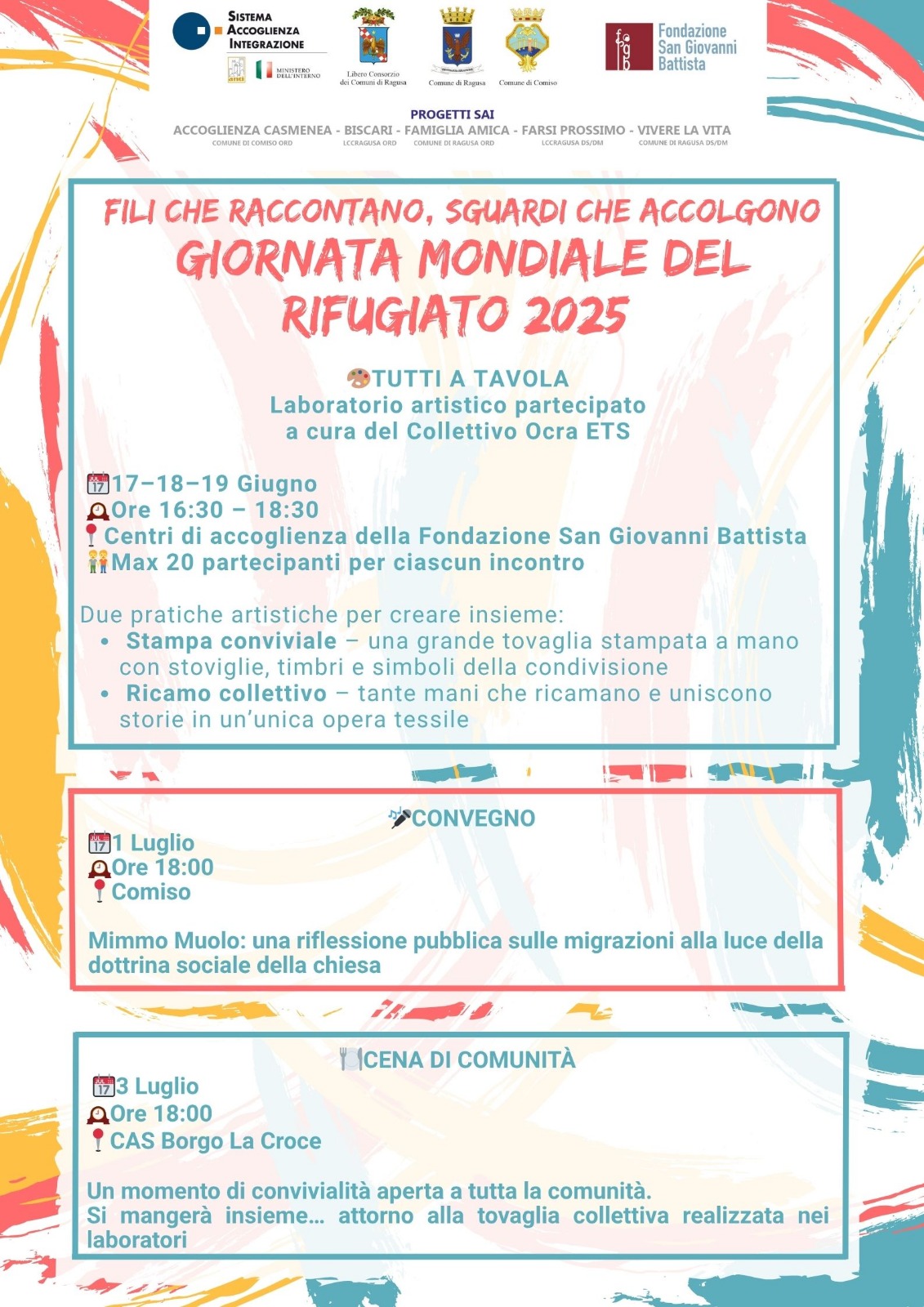 Il 3 luglio, infine, presso il centro CAS di contrada Borgo la Croce di Ragusa vivremo un momento di convivialità aperta a tutta la comunità. Si mangerà insieme attorno alla tovaglia collettiva realizzata nei laboratori.